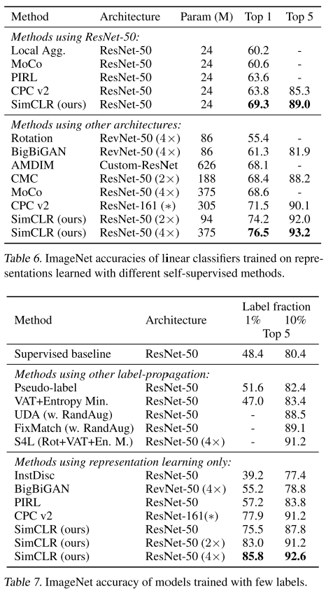 다른 모델과의 비교에서도 동일한 파라미터내에서는 더 잘 시각적인 표현을 학습해서 예측을 잘한 결과를 보여주고 있습니다 (Figure 6). 또한, ImageNet에서도 라벨이 거의 없는 이미지에 대해서도 Top 5예측성능이 우수하게 나오고있습니다.