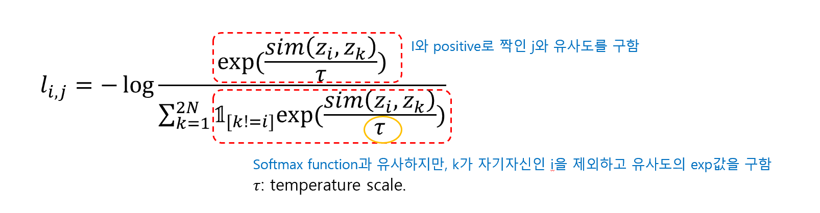 - 유사도 메트릭스 ($s_{i,j}$) 내에 각 행에는 2개의 positive 샘플이 있습니다. 하나는 자기자신이고, 나머지는 augmentation된 이미지 2장이 같은 origin이라는 positive sample pair입니다.
