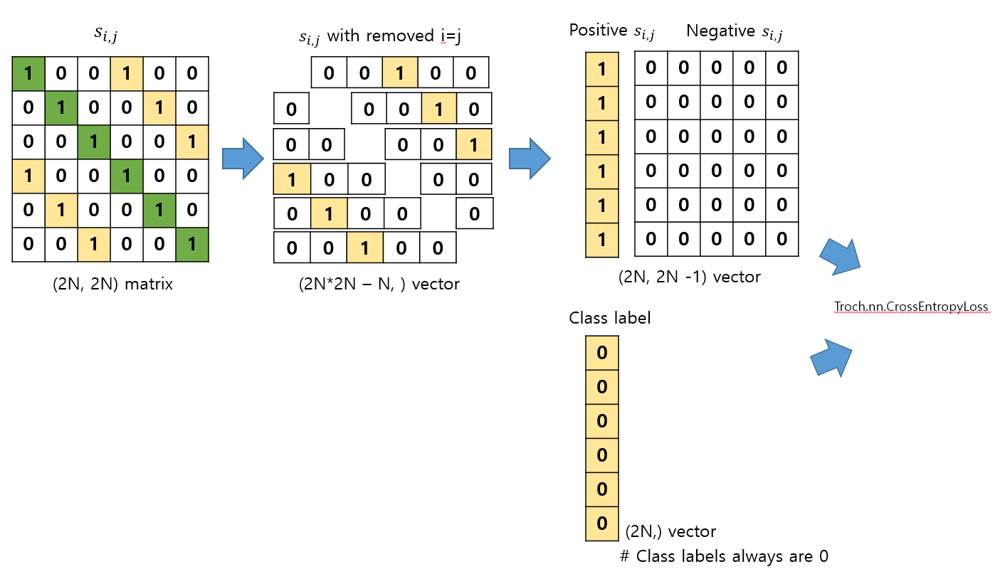 - 이 때, 라벨은 positive sample은 항상 0번컬럼에 존재하기에 np.zeros(2N)으로 만듭니다. 왜냐하면 torch.nn.CrossEntropy 구현체에서는 라벨에는 항상 정답라벨의 클레스번호가 들어가기 때문입니다. 정답라벨이 항상 0이기에, 그냥 np.zeros()로 들어갑니다.