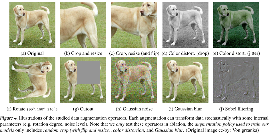 - Data augmentation: 한 이미지로부터 각각 다른 데이터증강방법을 이용해서 (x_i), (x_j)을 생성합니다. 이 두 이미지를 positive 데이터로 만듭니다. 위의 그림에서 t~T에해당하는 것이 data augmentation 방법입니다. 그 결과는 $\tilde{x}_{i}$, $ \tilde{x}_{j}$에 해당합니다.