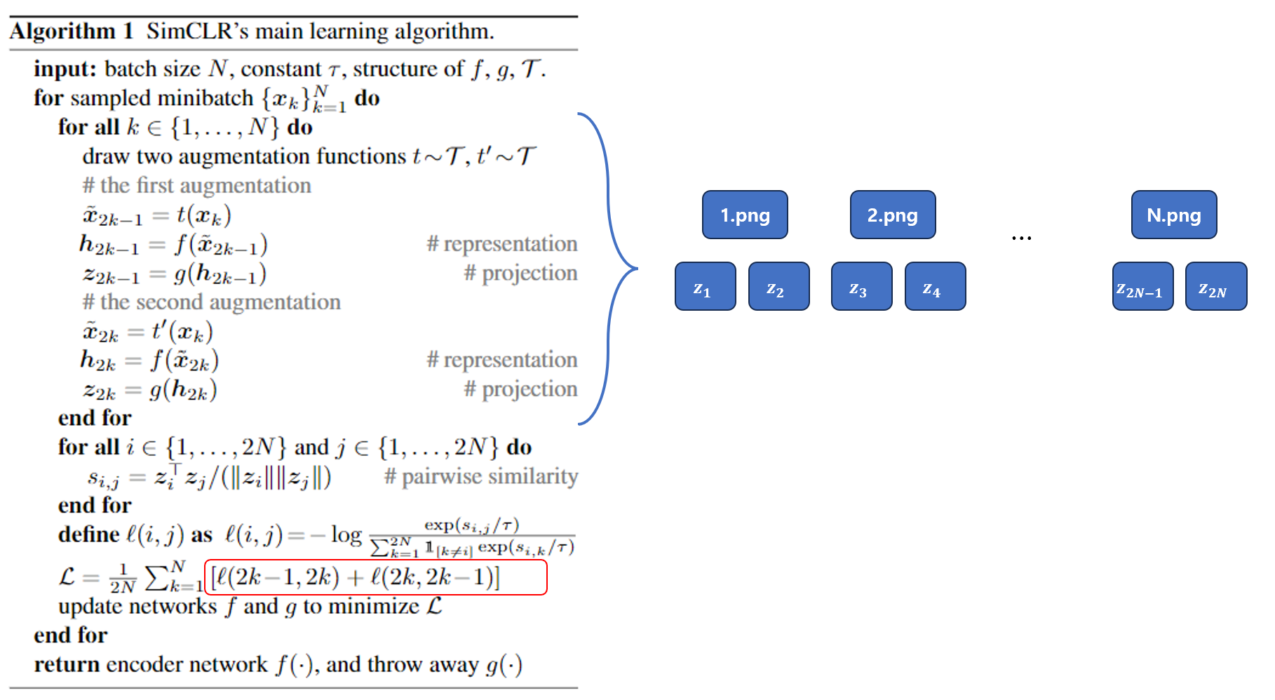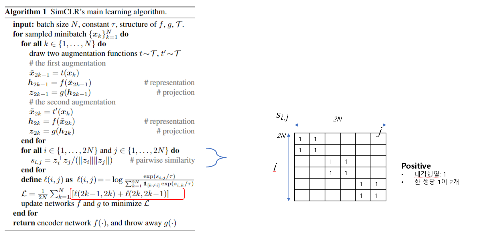 전체적인 SimCLR의 알고리즘은 아래와 같습니다. 그리고, 이를 시각화하면 아래와 같은 메트릭스 연산을 하는 것과 동일합니다.