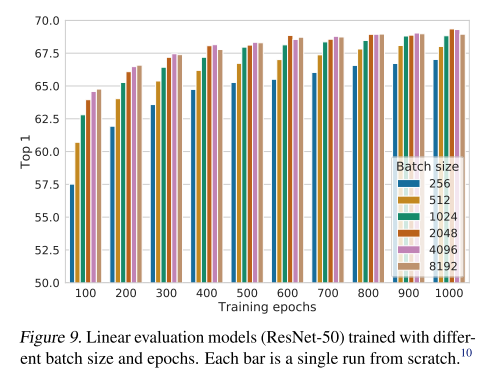 에폭이 적을때는 배치사이즈가 더 큰 사이즈로하는 것이 좋지만, 충분히 학습시킬 수 있는 epoch이라면 배치아시즈가 그렇게 영향을 주는 것 같지 않습니다. 이는 배치사이즈마다 샘플링을 각각 다르게하니, 시각적인 학습을 충분히 더 할 수 있음에도 100에폭밖에 학습을 못해서 충분히 학습이 안된것처럼 보입니다. Constrative learning에서는 더 큰 사이즈의 배치를 넣으면 negative가 엄청 많아지기에, 더 빨리 학습의 수렴을 유도하는것으로 해석해볼 수 있습니다(=더 빠른 이미지의 구별능력)