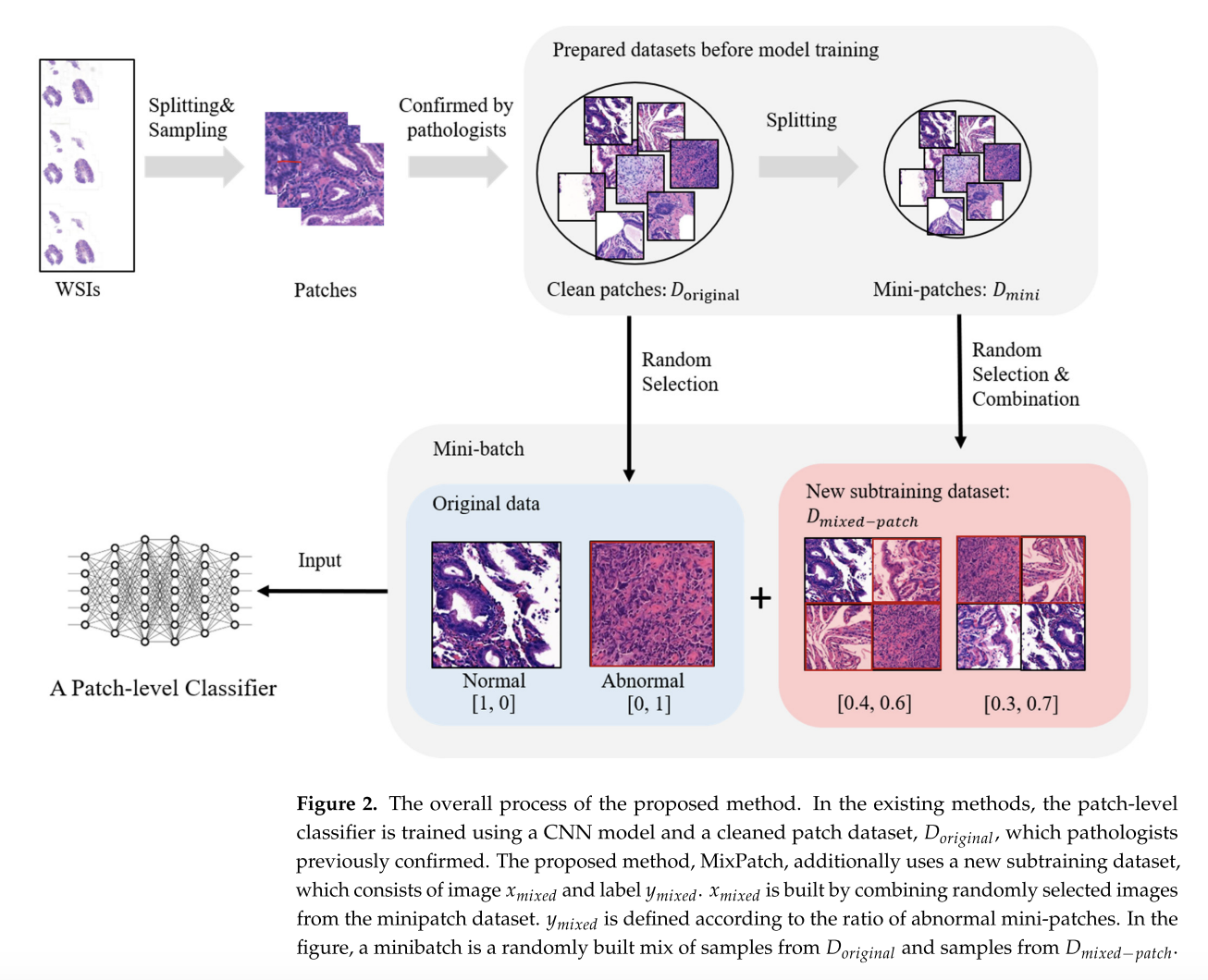 요약하면, 실제 WSI이미지에서 Ground truth로 annotation케이스와 real-case을 줄이기위해서 data augmentation전략(MixedPatch)을 사용하고, 이에 맞게 손실함수를 각각 원본데아터+증강데이터를 혼합하여 학습한 방법입니다.