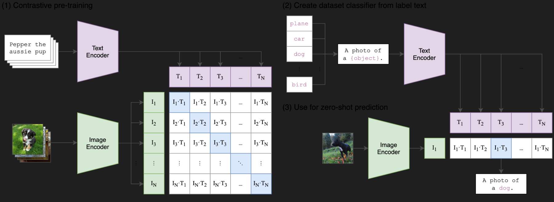 CLIP의 핵심아이디어는 이미지의 인식방법이 자연어로부터 배울 수 있다는 것입니다. 이를 위해 아래의 단계대로 실험을 진행했습니다.