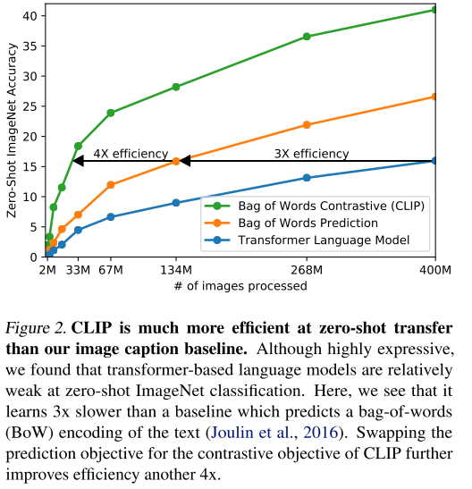 CLIP은 효율적인 사전학습을 찾으려고 노력한 결과물입니다. 연구 초기에 사전학습방식을 결정할때, 아래와 같은 3가지의 방법을 적용해보았습니다. 3가지 목적으로 각각 이미지는 ViT(Vision Transformer)로 인코딩하고, 텍스트는 Transformer로 인코딩한다음에 이미지의 캡션을 예측하도록 Joint traning을 진행했습니다. 각 3가지는 Transformer Language model은 언어 생성, Bag of words은 순서가 없는, Bag of words contrasative (CLIP)은 BOW에 대조적학습까지 적용한 방법입니다. 같은 파라미터라면, 성능은 CLIP이 훨씬 효율이 높아 CLIP으로 사전학습을 하는 것을 목표로 했습니다.