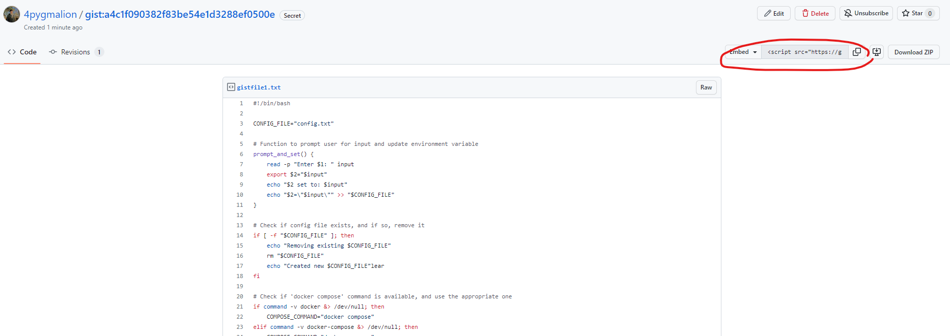 3. "Creat secret gist"을 누른후, html의 script src을 가져옵니다.
