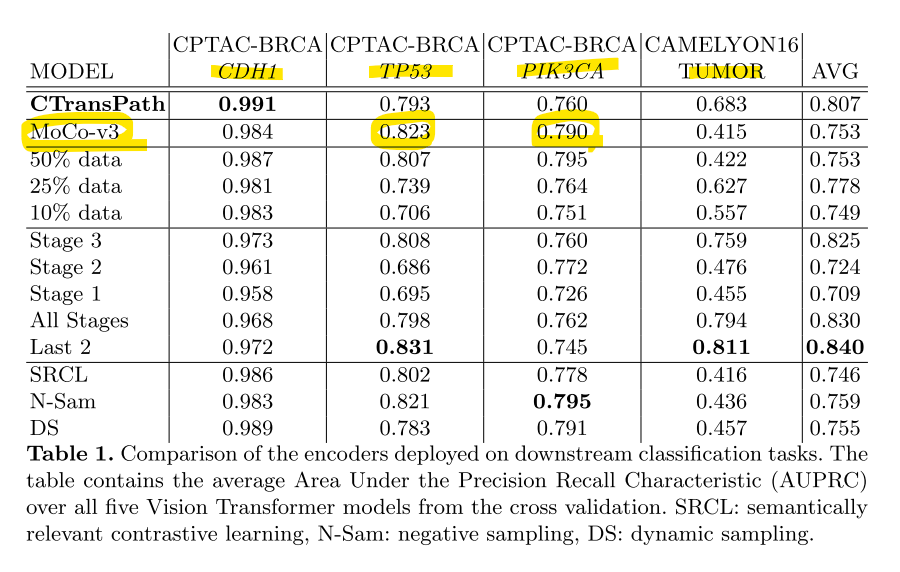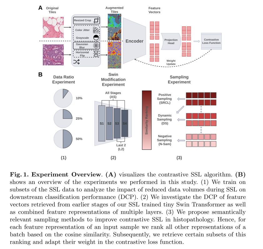 Breast cancer관련 병리이미지의 분류문제에서, SSL을 활용할 때, 전체 데이터셋을 다활용하지 않고 50%정도 활용해도 전체를 사용한 것과 비등한 결과를 냈음. 또한, 인코더 전체를 다 사용하지 않고 일부레이어만 사용해도 큰 퍼포먼스의 저하가가 발생하지 않고, 오히려 오르는 경우도 관찰됨