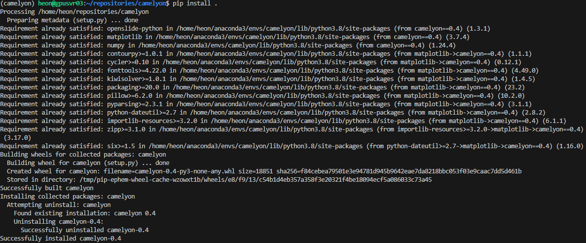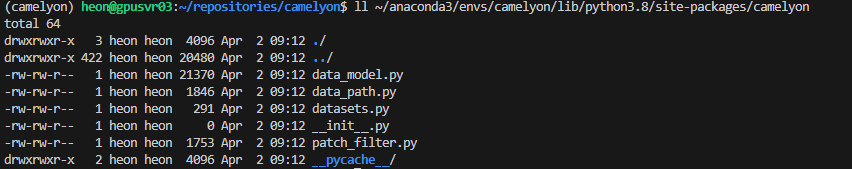 아래와 같이 잘 설치됨을 알 수 있습니다. 패키지 설치장소는 가상환경인 "/home/heon/anaconda3/envs/camelyon"에 설치되었습니다.