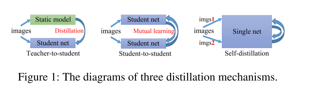 - self-distillation (self-teaching): 하나의 네트워크를 이용하며, 이미지 1개를 데이터 증강(random, rotation)등을 통해서 2개로 만들고, 서로 다른 지식을 일치시키는 방법을 사용합니다. 즉, 하나의 네트워크를 사용하며, 서로 다른이미지를 추론했음에도 분포가 같아야하는 모델 일반화가 더 잘되는 방법으로 학습을 유도합니다.