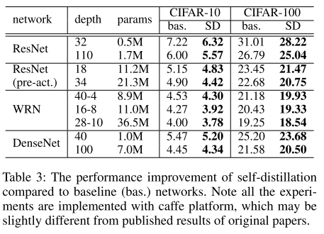 세 번째, 결과는 다양한 네트워크를 이용한 종합적인 성능인데, 모두 SD(Self-distilation)을 이용하는 경우 더 좋은 성능을 보였습니다.
