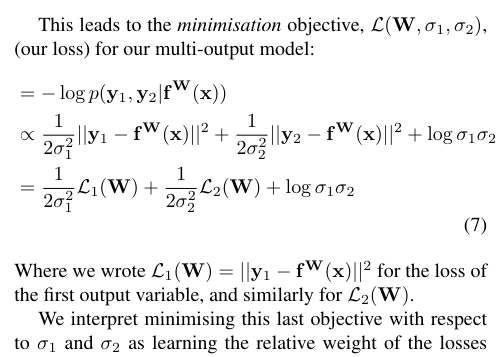 (7)번식의 마지막 식을보면, 불확실성을 타나내는 파라미터가 각 테스크의 가중치로 있고, 마지막에 $log{\sigma_{1}\sigma_{2}}$에도 있습니다. 이는 불확실성($\sigma_{i}$)가 큰 경우 해당, 테스크의 손실함수를 별로 반영하지않기 위함입니다.