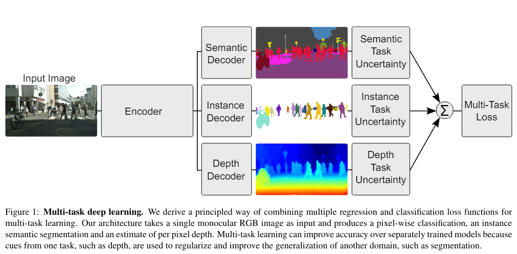 문제는 이 테스크들의 각각의 손실함수 1), 2), 3)이 있을텐데, 이 테스크를 어떻게 가중치를 주어야하는지에 대한 고민입니다. 1:1:1이 최적일까요? 아닐 수 있습니다. 보통 이 가중치(비율)을 휴리스틱하게 여러 번의 실험을 하면서 실험적으로 구하기에, 매우 비용이 많이듭니다. 본 논문은 MTL시에 가중치를 불확실성기반으로 최적화하는 방법을 제안합니다.