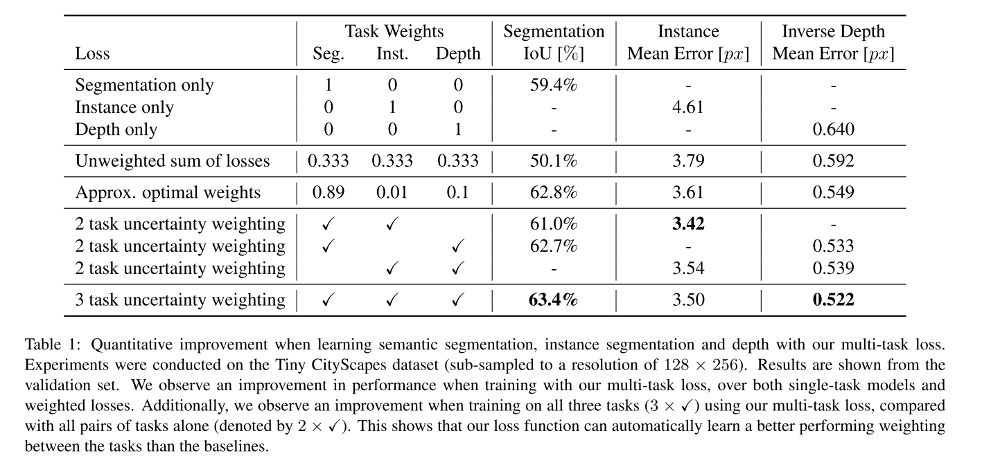 문제는 이 테스크들의 각각의 손실함수 1), 2), 3)이 있을텐데, 이 테스크를 어떻게 가중치를 주어야하는지에 대한 고민입니다. 1:1:1이 최적일까요? 아닐 수 있습니다. 보통 이 가중치(비율)을 휴리스틱하게 여러 번의 실험을 하면서 실험적으로 구하기에, 매우 비용이 많이듭니다. 본 논문은 MTL시에 가중치를 불확실성기반으로 최적화하는 방법을 제안합니다.