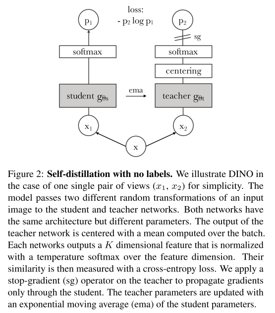 DINO을 가정은 2가지 모델이 있다고 가정합니다. 일반적인 student, teacehr모델은 크기가 다른 반면, DINO에서는 두 모델의 아키텍처는 동일합니다.