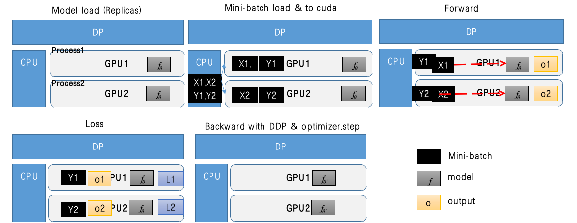 - 각 프로세스간 통시는 torch.distributed 패키지를 이용해서, 그레디언트와 버퍼(buffer)을 동기화함. 즉, 각 프로세스에서 모델의 복사본(Replicas)가 존재하지만, 따로따로 학습하는 것이 아니라, 데이터 배치만 나눠서 처리하고, 역전파 단계에서 GPU 그레디언트를 동기화해서 동일한 업데이트를 진행함.