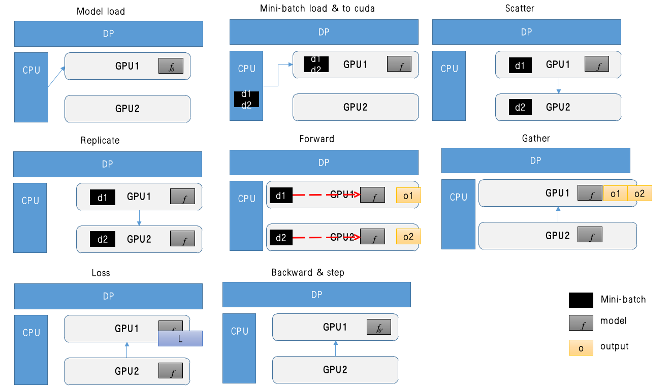 DP은 데이터 병렬화 기술 중, 싱글노드에서만 사용할 수 있는 병렬화 기술입니다. DP은 한 프로세스에서만 돌아가기에 "Single process, multi-threaded"입니다. 하나의 프로세스에서 여러 GPU을사용하는 방식입니다. 즉 하나의 프로세스이기 때문에, 모델과 데이터를 한 번만 메모리에 로드하고, 공유하는 방식입니다. 레핑코드인 torch.nn.DataParallel은 다음과 같은 방법을 따릅니다.
