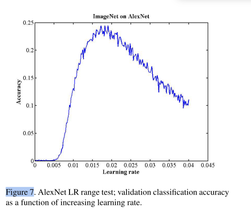 또 다른 예시로, AlexNet의 LR range test의 결과를 보여드리겠습니다. 학습율(x축, learning rate)이 0.006이전까지는 학습이없다가 0.006정도부터 학습이 되기에, base_lr은 0.006으로 셋팅하면됩니다. 그리고, 이 그레프에서 0.015부터 학습률이 지속적으로 감소하기에 max_lr은 0.015으로 학습하는게 합리적이라고 합니다.