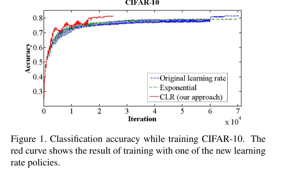 CLR을 사용하는 경우는 아래의 그림(Figure 1)과 같이 더 적은 iteration내에 빠른 수렴을 실험적으로 할 수 있음을 보여주었습니다. CLR은 학습율을 증가시키는 것이 짧게는 학습에 부정적인 영향을 끼치지만, 학습의 긴 추이에서는 더 나은 최적화를 보여준다는 것을 경험적으로 확인해서 제안된 것입니다.