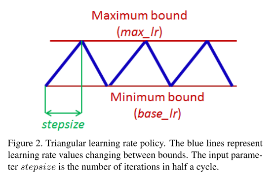 아래는 triangular window (linear)의 방법입니다. 최대학습률, 최소 학습률, 스텝수(stepsize)의 3가지 파라미터를 사용자가 지정했을 떄, 최대최소율에 맞추어 증가, 감소하며 학습률이 변경됩니다. stepsize 반복할때까지 maxmum bound까지 올라가고, 이후 그 다음 stepsize까지 반복해서 최소학습률에 도달하는 식입니다. 파이토치에는 이를 구분하여 구현되어있습니다.(step_size_up, step_size_down)