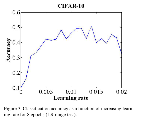 - LR range test: 모델을 적은수의 에폭만 미리 돌려보는것입니다. 예를 들어, 2에폭정도에 learning rate을 0부터 0.02까지 바꿔본다고 생각해보겠습니다. 2에폭정도 돈 후에, learning rate, accuracy의 라인플롯을 그립니다. accuracy가 나오게되는데, 0부터 증가했다가 감소하는 구간을 보입니다. 저자들은 증가하는 시점의 learning rate과 감소하는 시점의 learning rate이 base_lr, max_lr로 선택하는 것이 좋다고 주장합니다. 또는 최적의 학습율을 보이는 수의 2배 내에 있기 때문에, base_lr과 max_lr의 크기가 3~4배정도 주게 하면 좋다고합니다.
