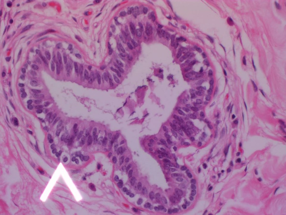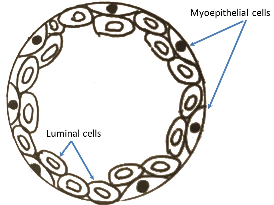 - 내부 레이어는 luminal cell이고, 단층이거나 여러층처럼 보이는 경우가 있음. outer layer은 myoepithelial cell임. 어떤 책에서는 luminal cell들이 columnar layer을 이루고 있다고하는데, 이게 맞을 것(?) 같음. 내부 레이어의 핵은 중앙 또는 하단부에 위치해있음.