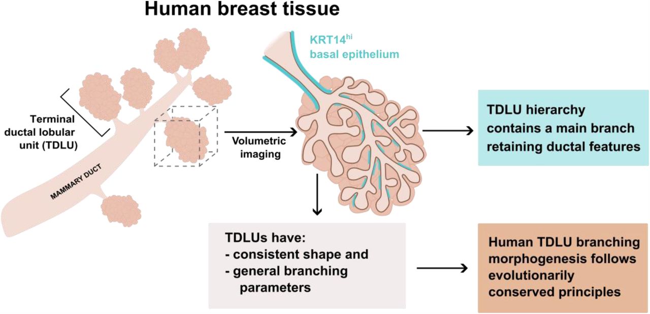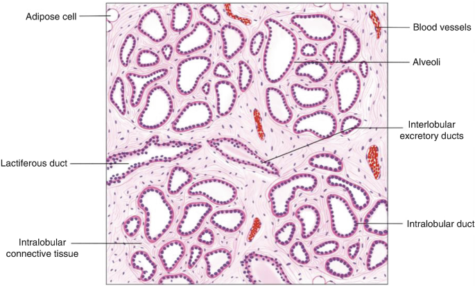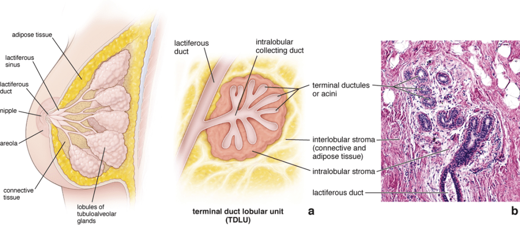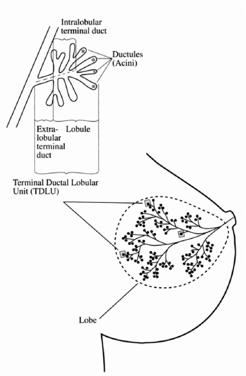- Terminal Ductal Lobular Unit (TDLU): 유선(mammary duct)의 끝 부분에 위치하여 모유를 생산하는 작은 단위