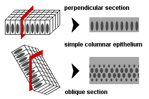 - Simple columnar epithelium: 길죽한 형태의 단층을 가진 상피. 세포의 핵이 같은 높이만크 위치하기도하지만, 바닥쯤에 있는 경우도 있음. 주로 소화기계에서 발견됨.