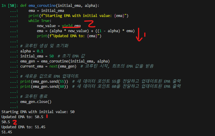 current_ema = next(ema_gen) # 코루틴 시작, 최초의 EMA 값을 받음