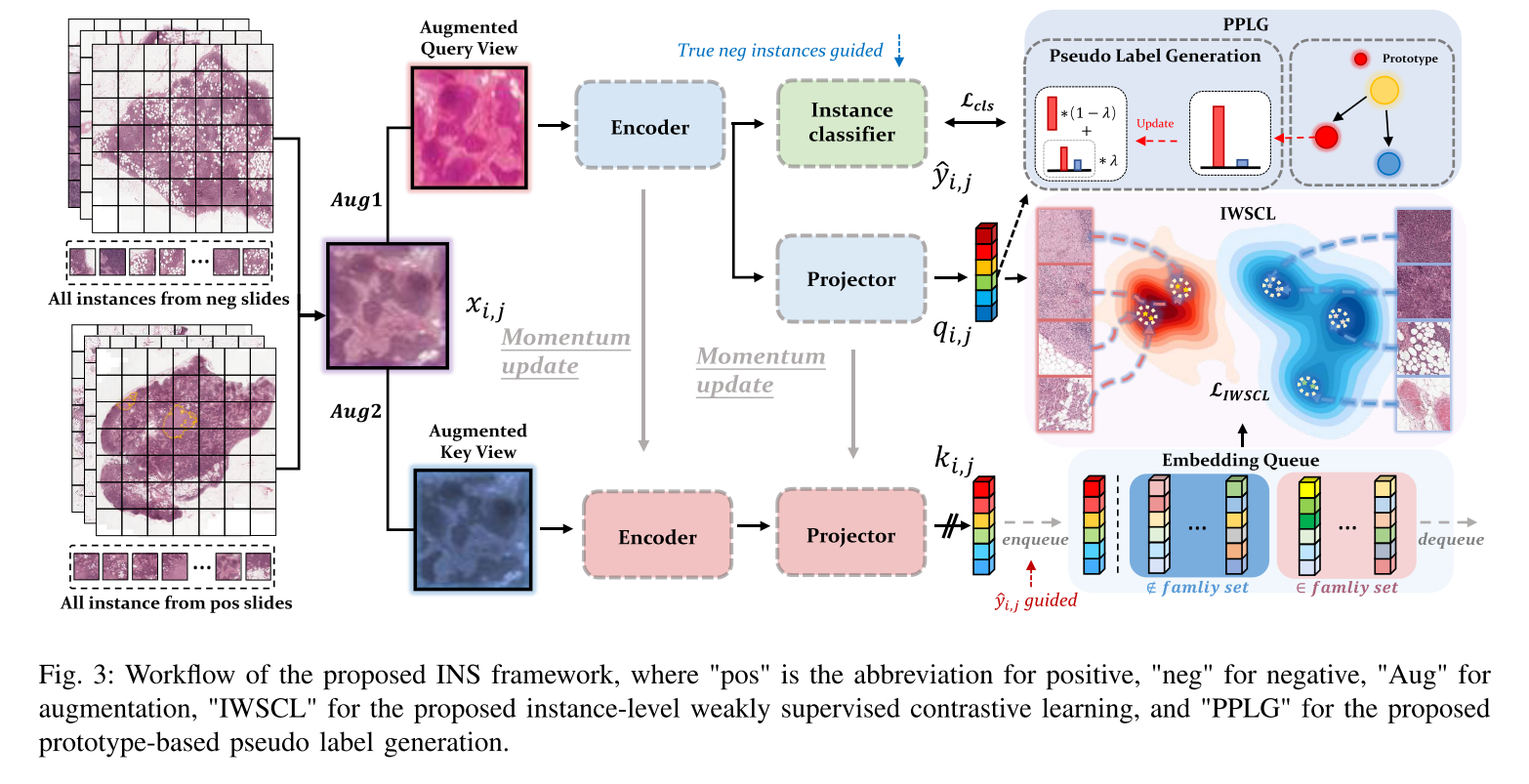 방법론 개괄: instance-based MIL에 1)contrastive learning, 2)prototype learning을 합친 INS을 제안