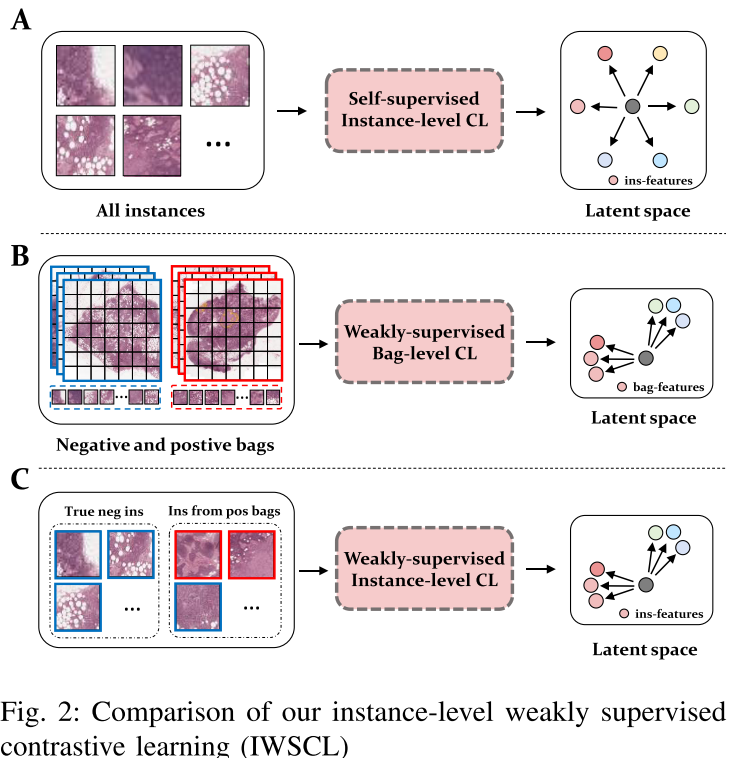 - Instance-base method: Bag label을 그대로 인스턴스 label로 할당하는 방법을 의미함. Instance pseudo label(할당된 라벨)의 노이즈가 많음. 실제 인스턴스 라벨을 모르기 때문에, 인스턴스 분류기의 품질을 모르고, 성능에 차이가 많이남 (Figure A).