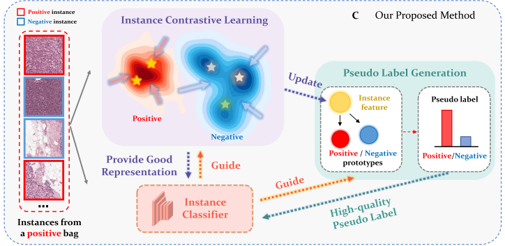 - Positive key, Negative key selection: SuperCon(https://analytics4everything.tistory.com/303) 과 같은 알고리즘으로 contrastive learning을 진행. 차이라면, SuperCon에서는 instance label이 hard label로주어졋다면, 이 논문에서는 instance classifier와 negative bag을 이용해서 얻었다는 차이