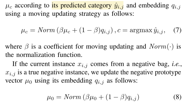 - True negative guided update: 패치가 negative positive bag에서 획득된 경우, 해당 패치도 negative일 것임. 따라서, $s_{i,j}=0$을 직접할당. 그리고 프로토타입 벡터도 이 임베딩값($q_{i,j}$)을 할당.