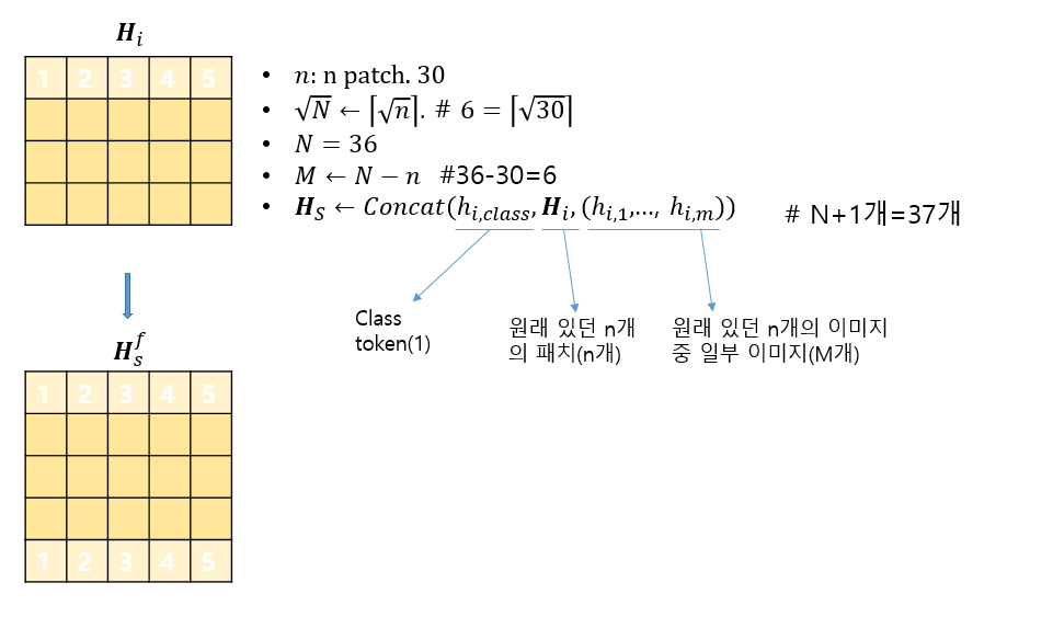 하지만, 이렇게 가공하면, 정방이 안나오기에, 정방이 나올수 있도록, 부족한 패치는 앞의 패치에서 따와 붙여줌. 그렇게 만든 패치의 모음이 $H_{s}^{f}$
