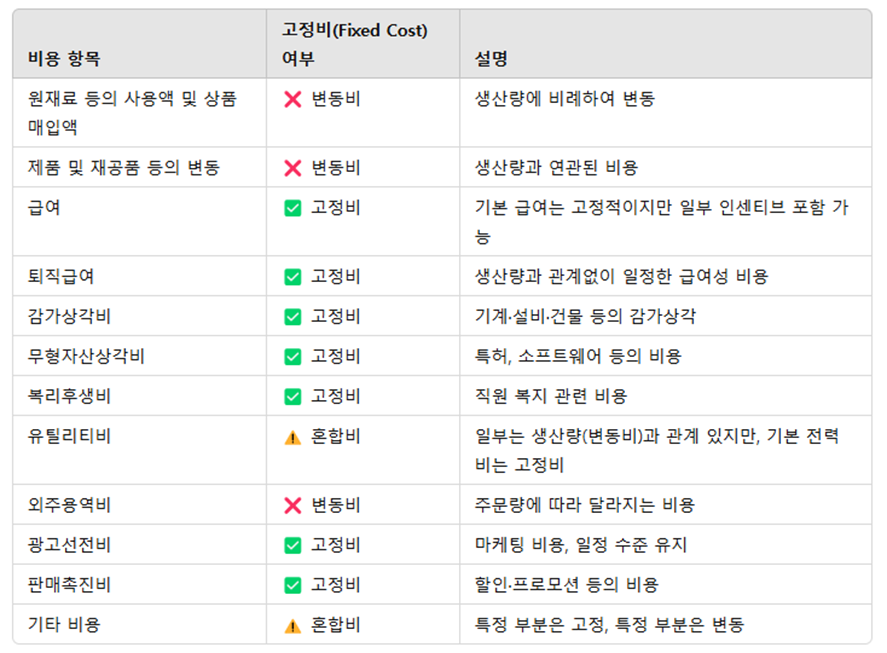 - 고정비/변동비의 구분은 기업마다 다르기에, 똑같은 회계기준으로 통일하기 어려움 => 기업의 내부적으로 관리