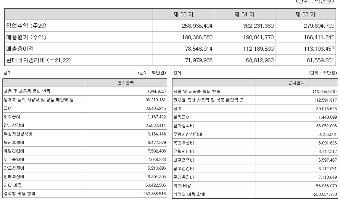 제 55기의 삼성전자의 매출액(=영업수익)에서 258,935,494백만원인데, 당기에 "21. 비용의 성격별 분류" 주석을 보면, 비용에는 같은 항목들이 있었음. 총 비용 252,368,518백만원은 아래의 크게 2항목의 구성됨.