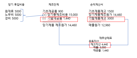- 매출원가 (완성단계에서 사용) = 기초제품 재고액 + 제품 제조원가 - 기말제품 재고액