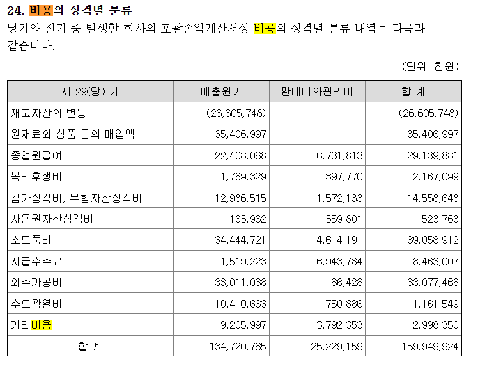 아래는 티씨케이의 29(당)기 비용의 성격별 분류이다. 아래의 사항을 확인할 수 있다.