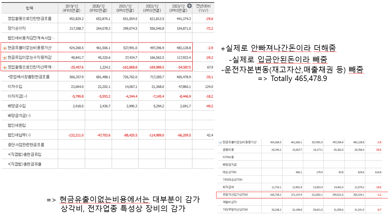 - 설비투자는 기업의 미래 성장을 위한 지출로, 현금이 실제로 유출되는 항목.