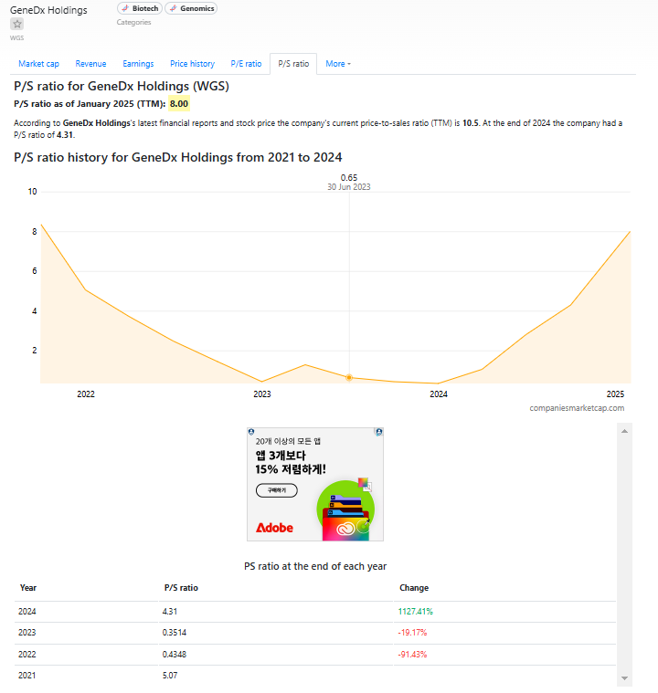 초우량기업은 아니지만, GeneDx라는 회사의 매출액 성장추이가 가파른데, PSR로보면, 23, 22년에 매우 작은 시가총액을 보임