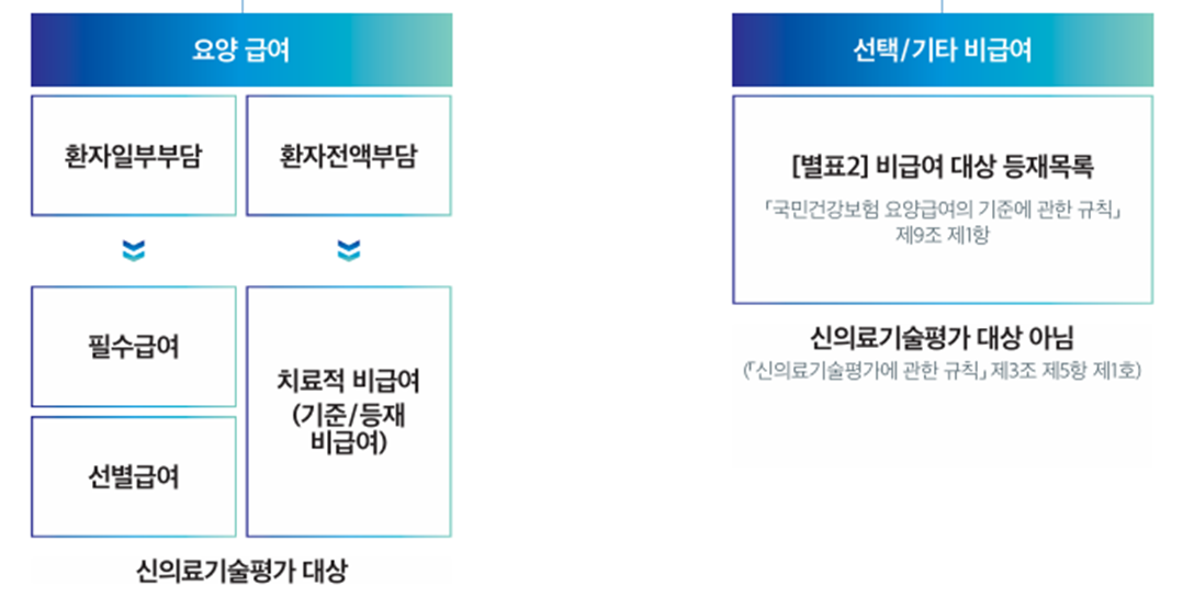 - 선별급여: 특정 조건을 충족한 경우에만 건강보험 혜택을 받을 수 있는 의료서비스 (의료 필요성과 경제적 효과성을 고려해서 선별적, 환자본인부담이 높은 수준) (예, 신의료기술, 특정조건하에 MRI, PET, 초음파, 로봇수술)