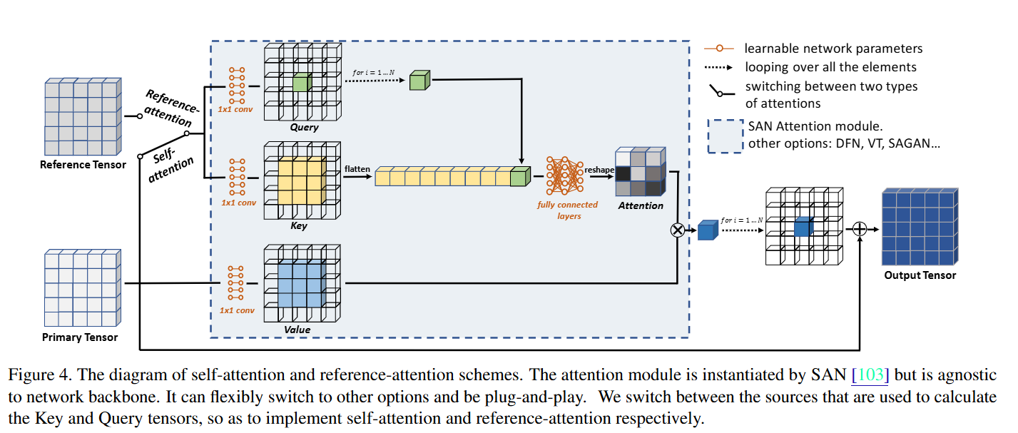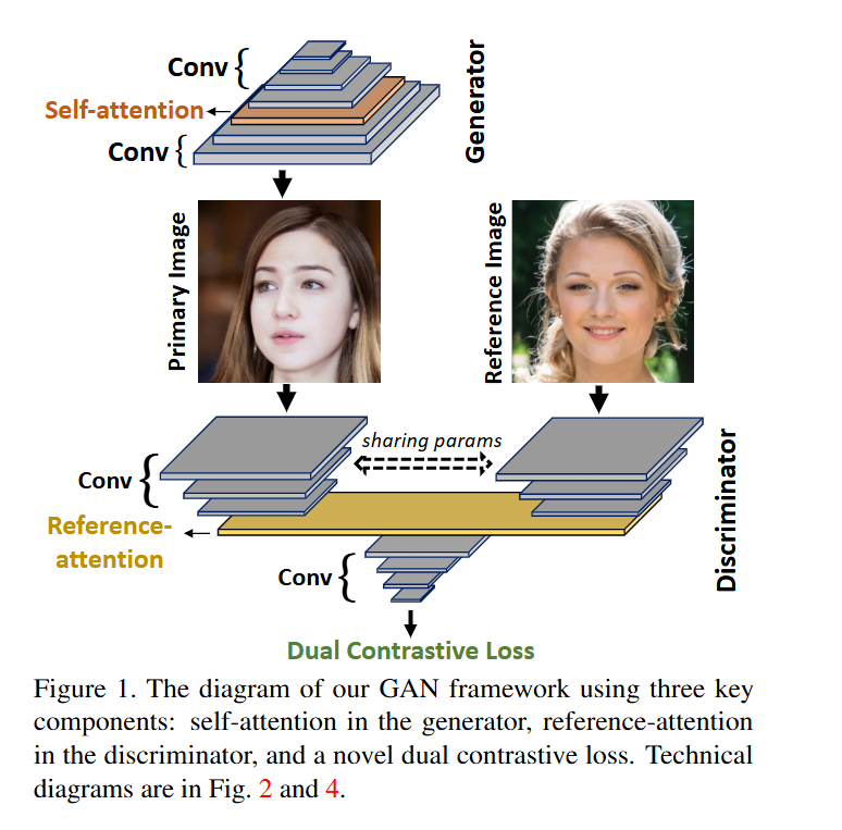 - Reference-attention: Discrimiator내에 있는 장치로, query image가 진짜인지 가짜인지 reference 기준으로 판단할 수 있게 도와줌.