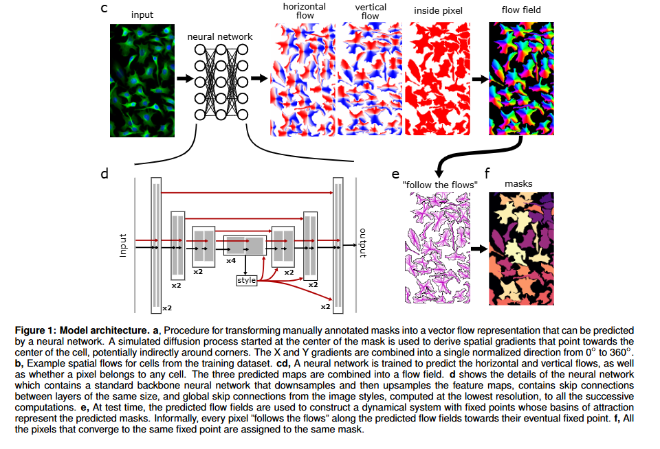 - Cellpose에서는 bounding box도 없고, instance ID도 정해져있고, 한 이미지에서 모든 인스턴스를 찾고 분리해야할 때, 픽셀마다 얘가 어떤 그룹인가를 알아야하는데, 그 용도로 flow field을 만듬. (보통 이를 구분하려고 Mask R-CNN에서는 ROI별로 인스턴스를 찾고, 그 안에서 마스킹예측)