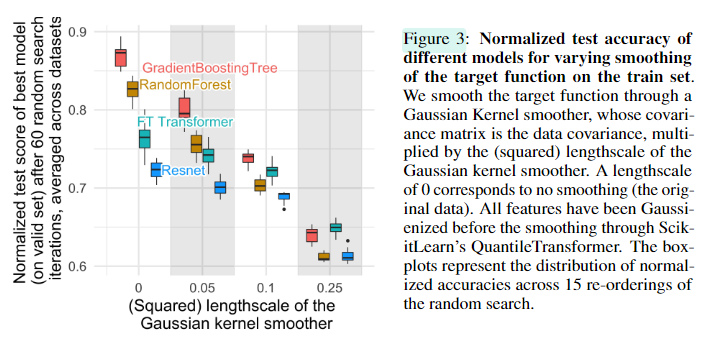 - 뉴럴넷은 smooth solution 을 inductive bias을 갖기 때문에: 연구자들이 훈련데이터를 가우시안 커널을 이용하여 조금더 soothing하게 펼친 데이터를 만들고, 트리기반모델과 신경망모델을 비교했습니다. 신경망모델은 성능이 적게 떨어지는 반면, 트리기반모델은 급격히 떨어집니다 (Figure3). 이는 트리 기반모델이 예측시에 비선형 if, else등으로 자잘하게 쪼개는 반면, 뉴럴넷은 부드럽게 예측구분을 나눠주기 때문이라는 근거의 결과가 됩니다 (Figure 20).