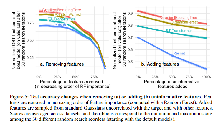 - 인공신경망은 별로 정보량없는 데이터에대해 영향을 많이 받음: 정형데이터는 꽤 정보량없는 특징값이 많습니다. 랜덤포레트를 이용하여, Feature importance가 작은순으로 특징값을 제외시켜나가면서, GBT(Gradient boosting Tree)을 학습시켜나갔더니, 특징값이 꽤 많이 없어질때까지 좋은 성능을 냅니다 (Figure 4).인공신경망에서도 비슷한 패턴이보이긴합니다 (Figure 5). 하지만, 불필요한 정보를 특징값으로 넣는 비율이 클수록, 트리기반 모델보다 급격히 성능이 하락합니다 (Figure 6)